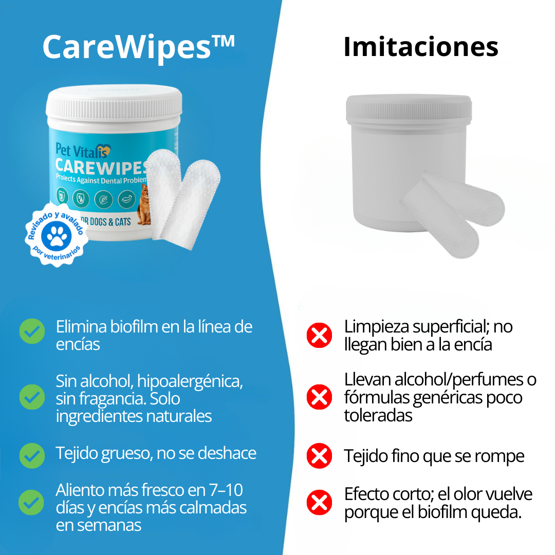 No esperes a que una emergencia con anestesia ponga en riesgo su salud. Las toallitas dentales CareWipes™ de grado clínico ayudan a prevenir enfermedades dentales, pérdidas de piezas y tratamientos veterinarios complicados antes de que sucedan.